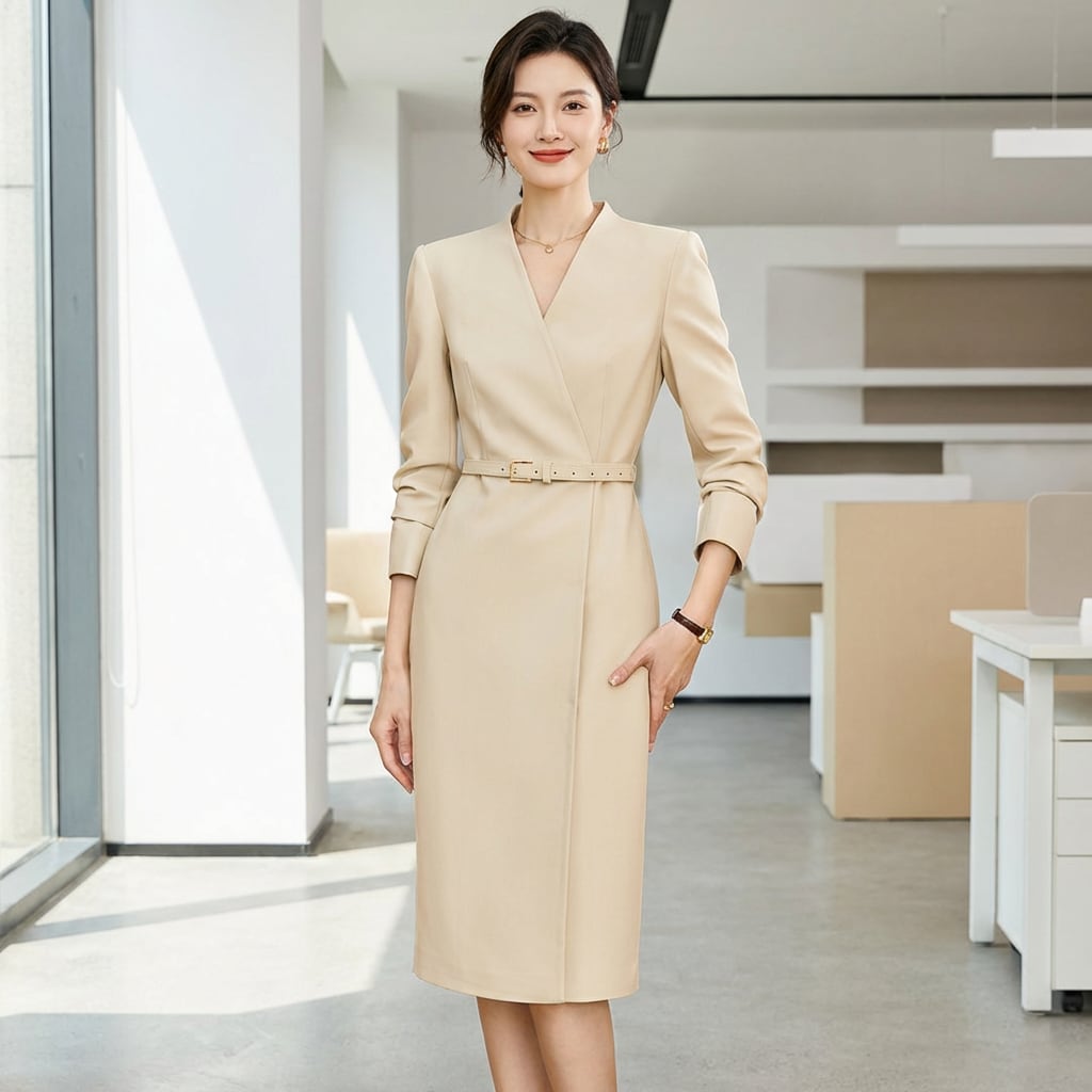 洗練されたVネックとウエストマークが、女性らしいシルエットを演出するミディ丈ワンピース。オフィスシーンからちょっとしたお出かけまで幅広いシーンで活躍します。着回し力も抜群で、様々なスタイリングを楽しめる一着です。