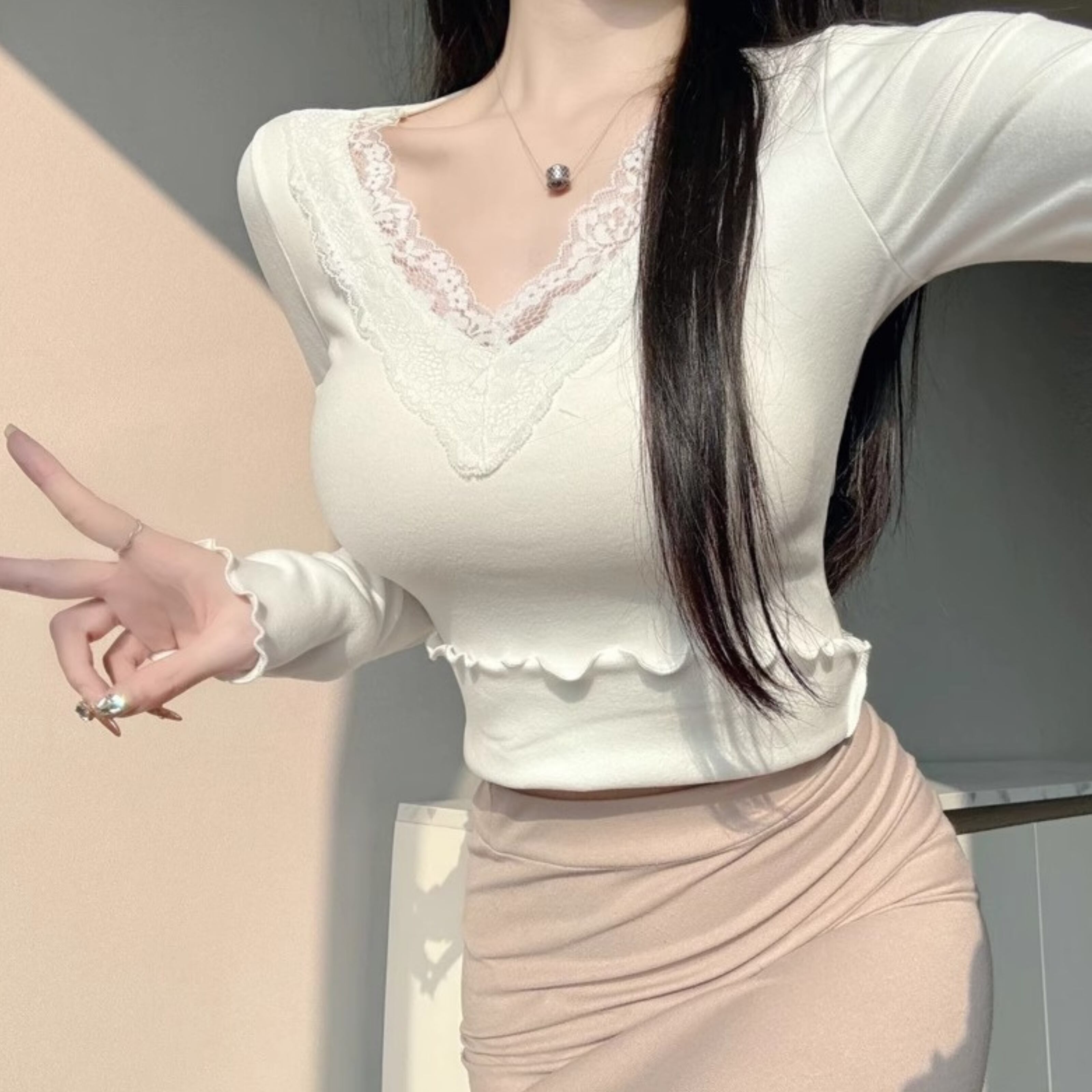 Vネックレースロングスリーブシャツ(3color)A1027