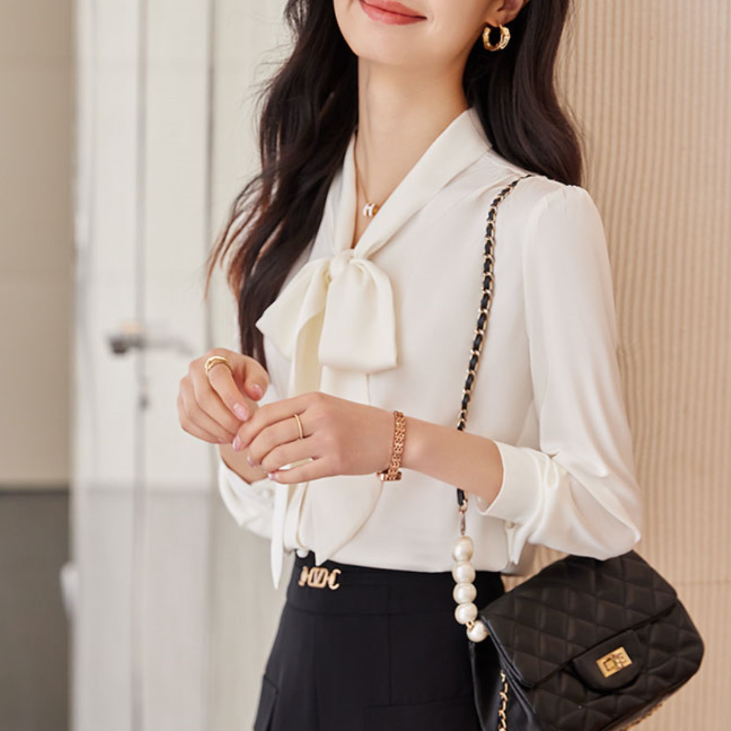 スタンドカラーロングスリーブリボンブラウス(3color) A1126