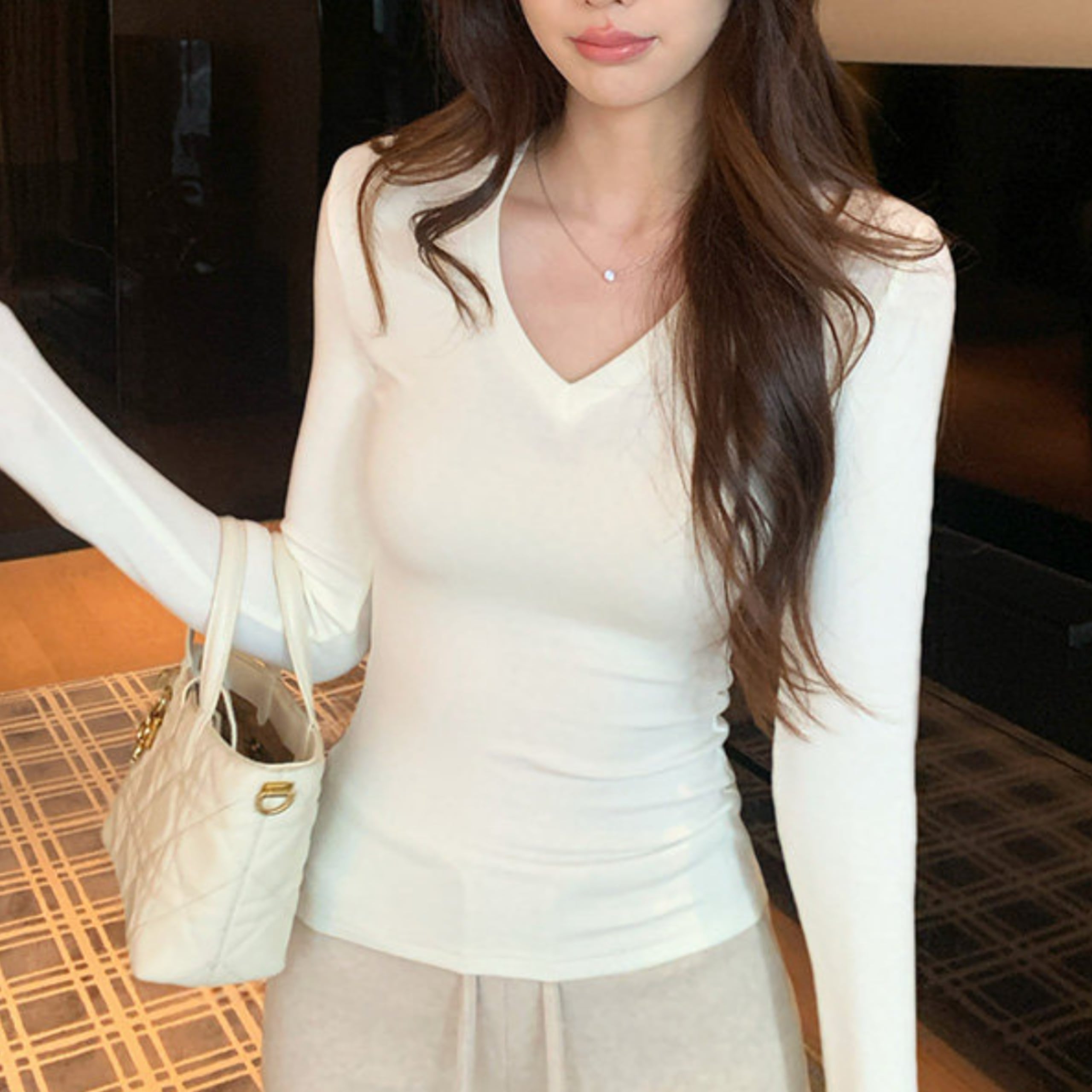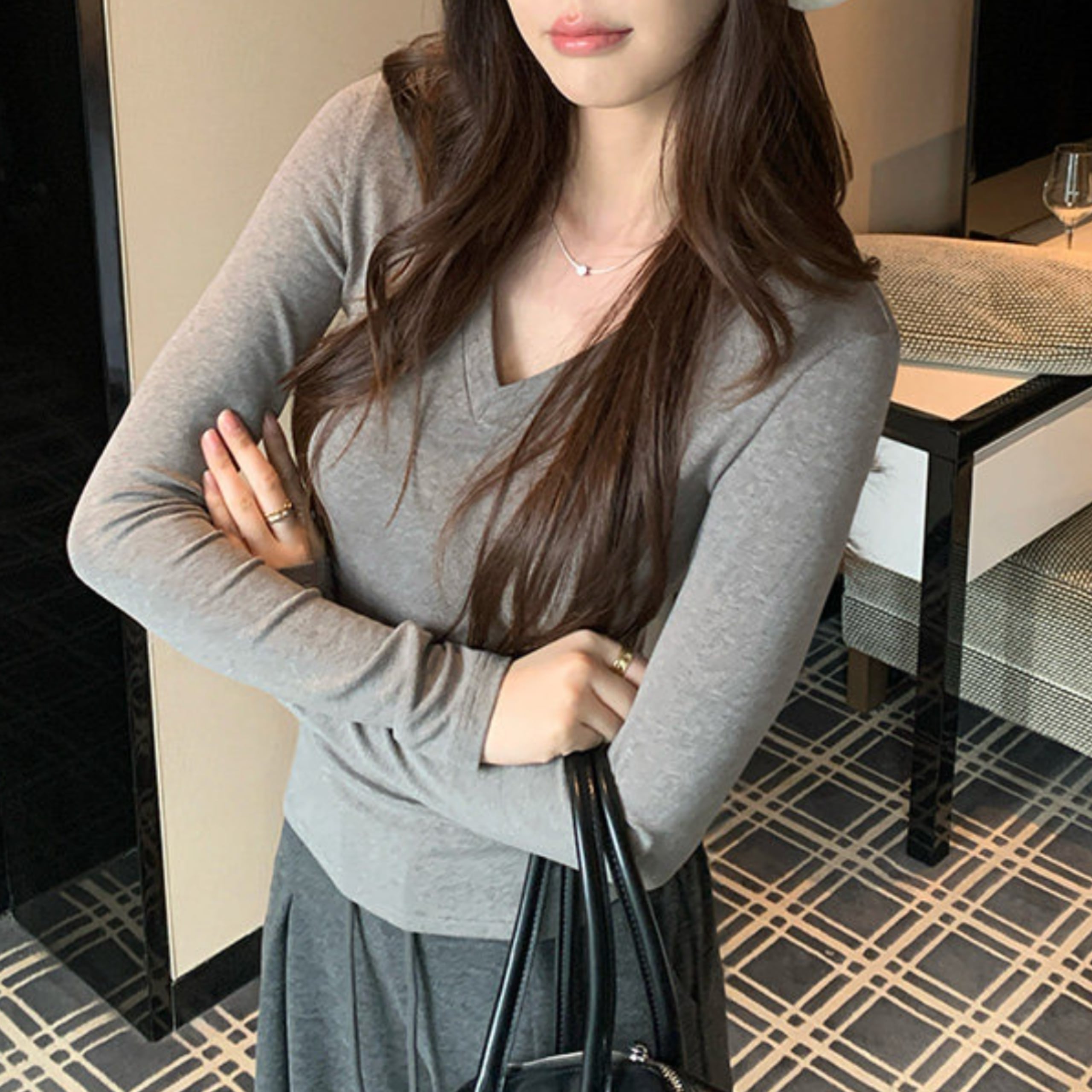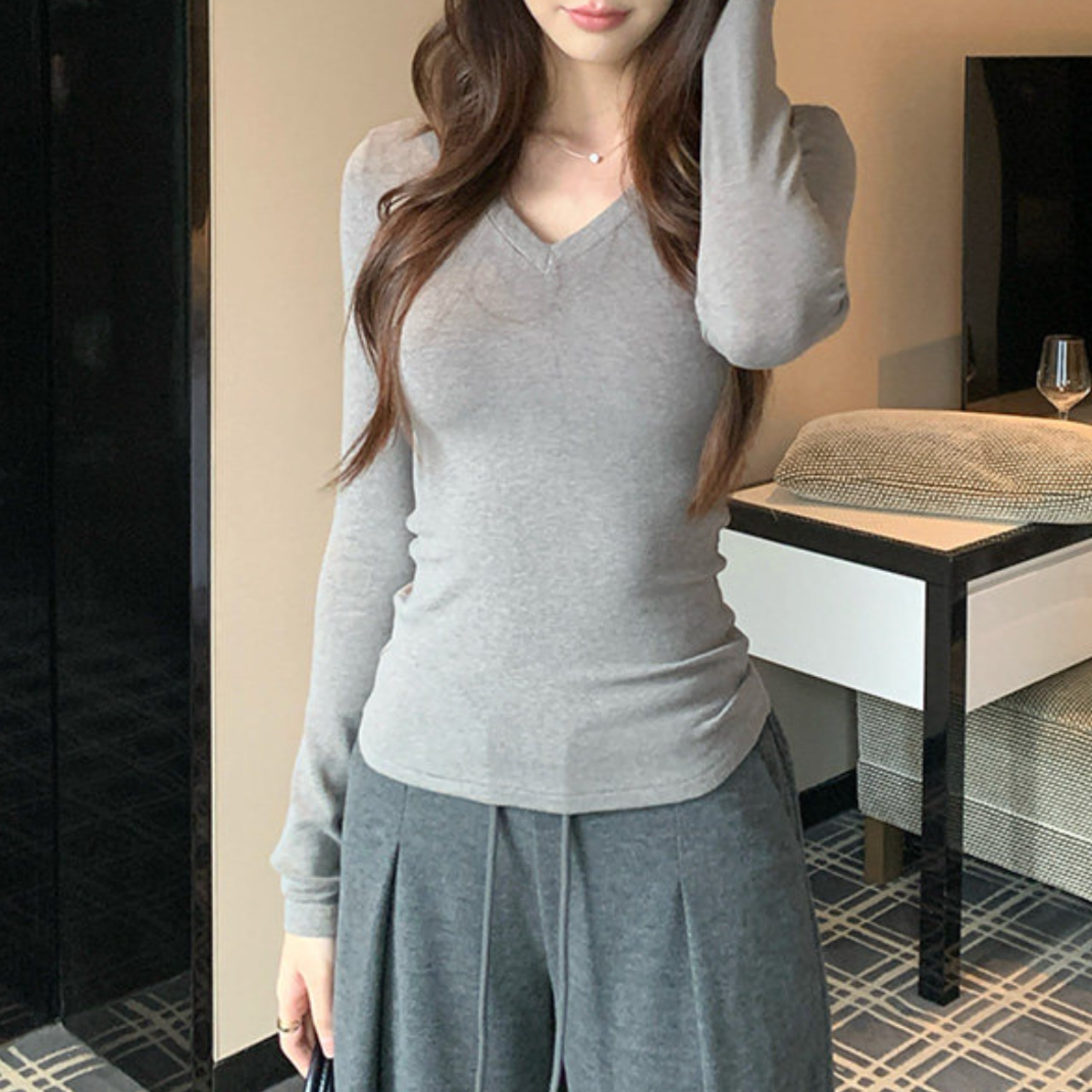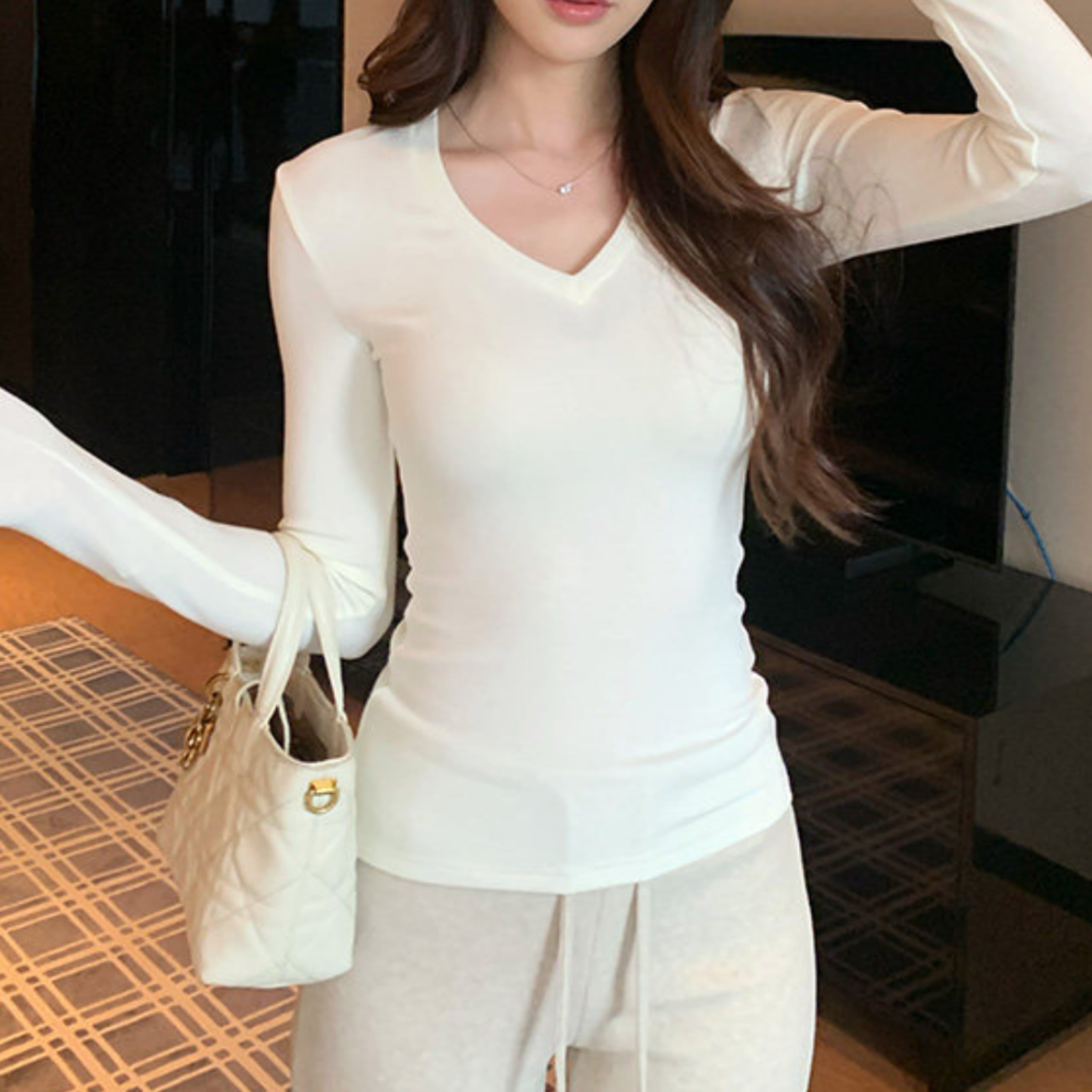Vネックソフトラインフィットトップス(4color) A1157