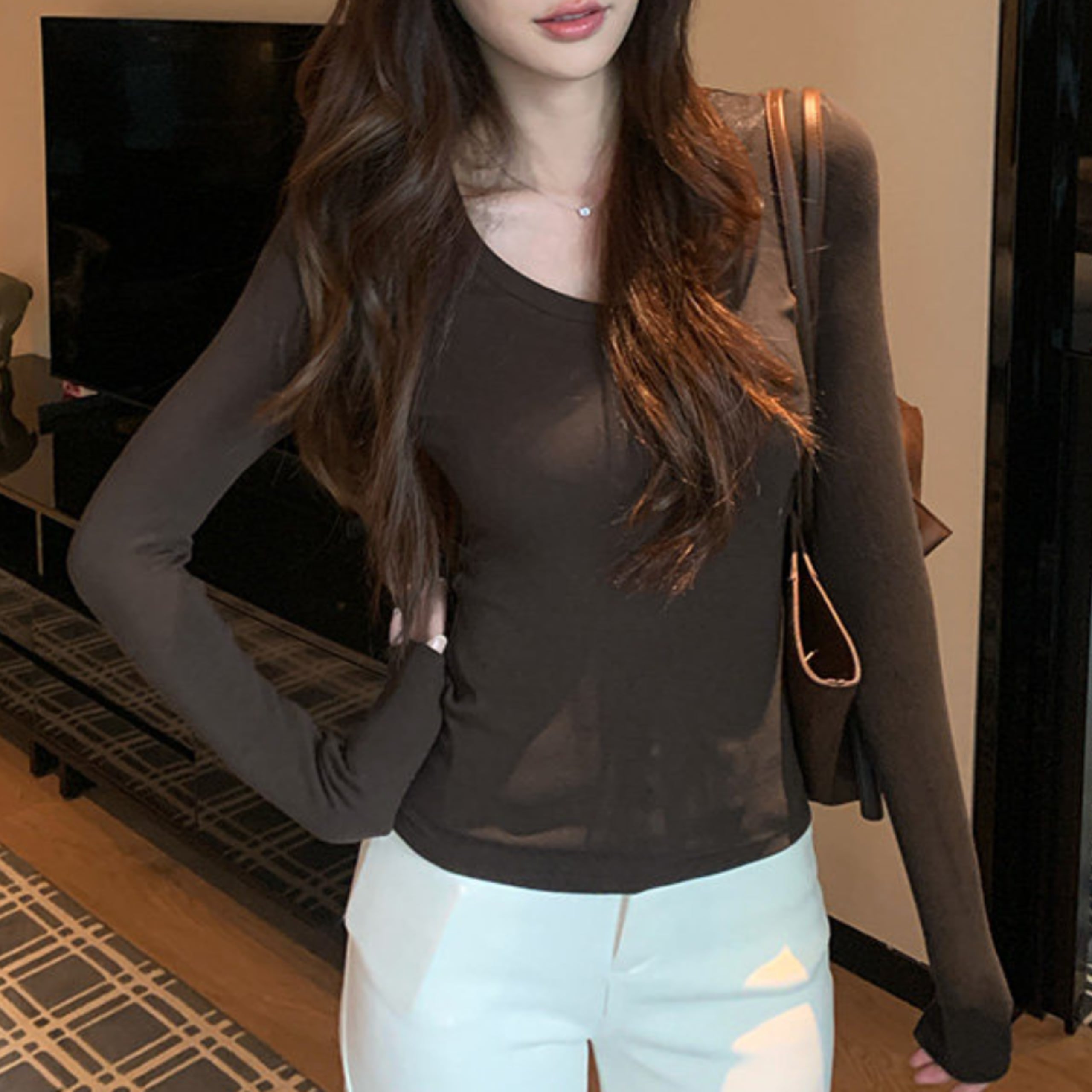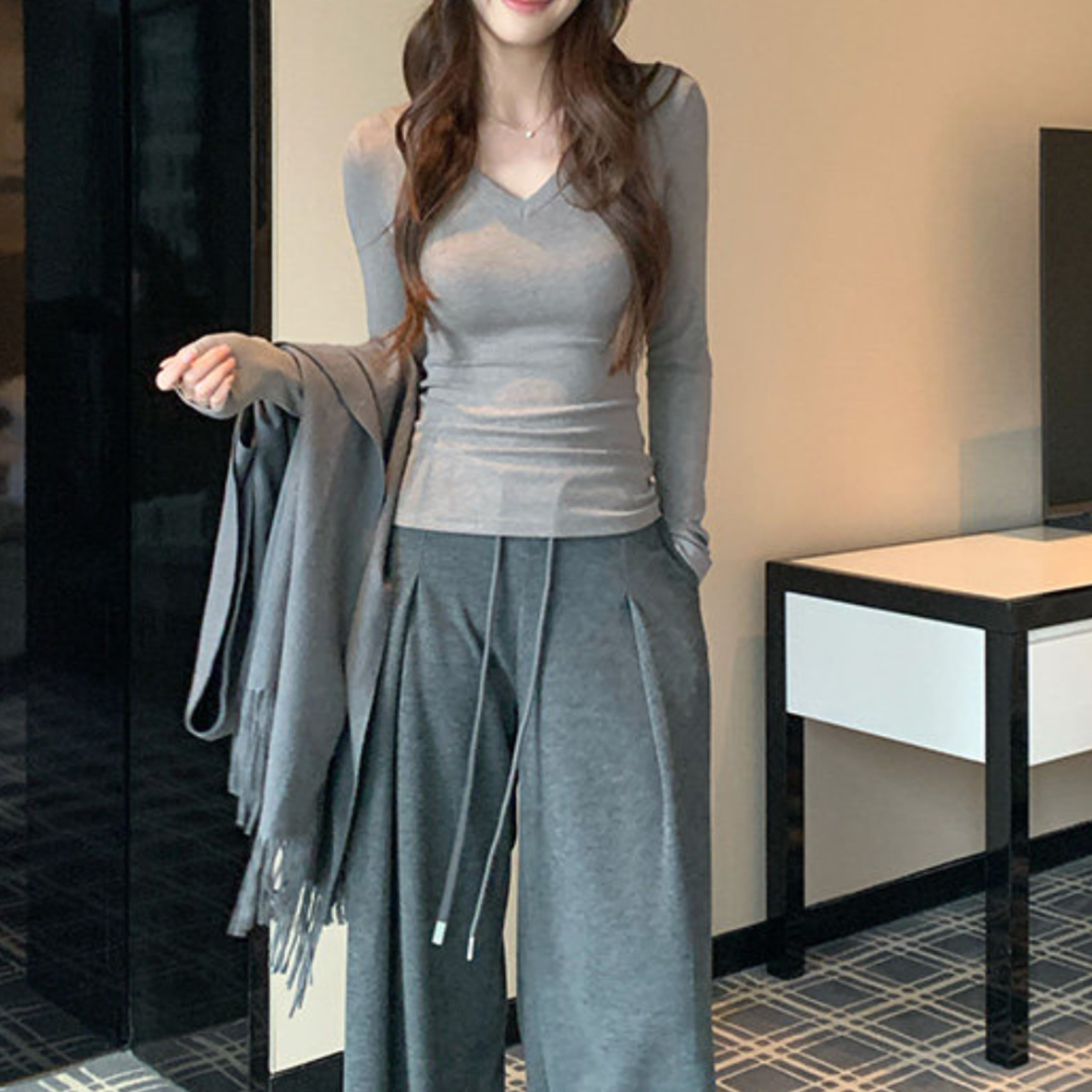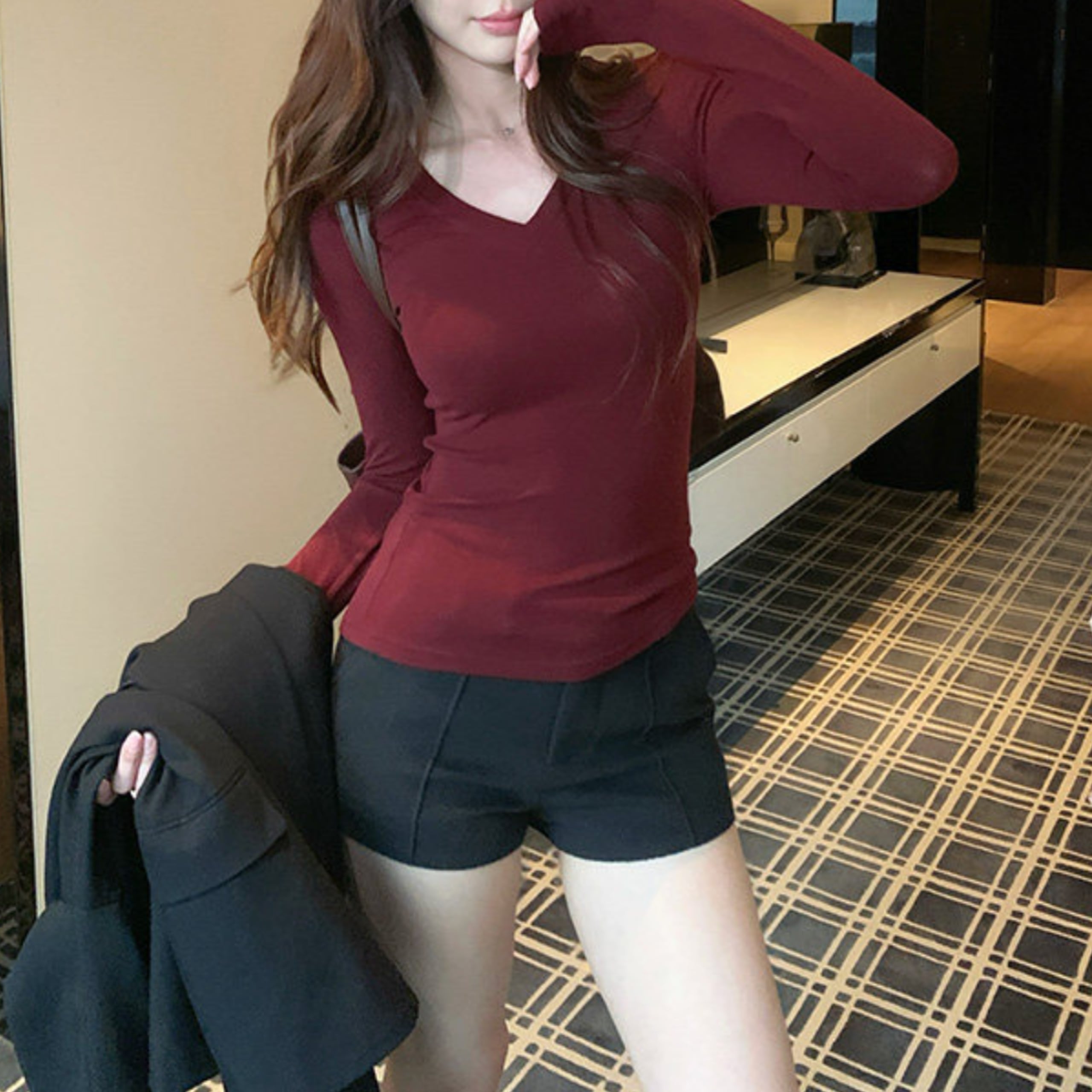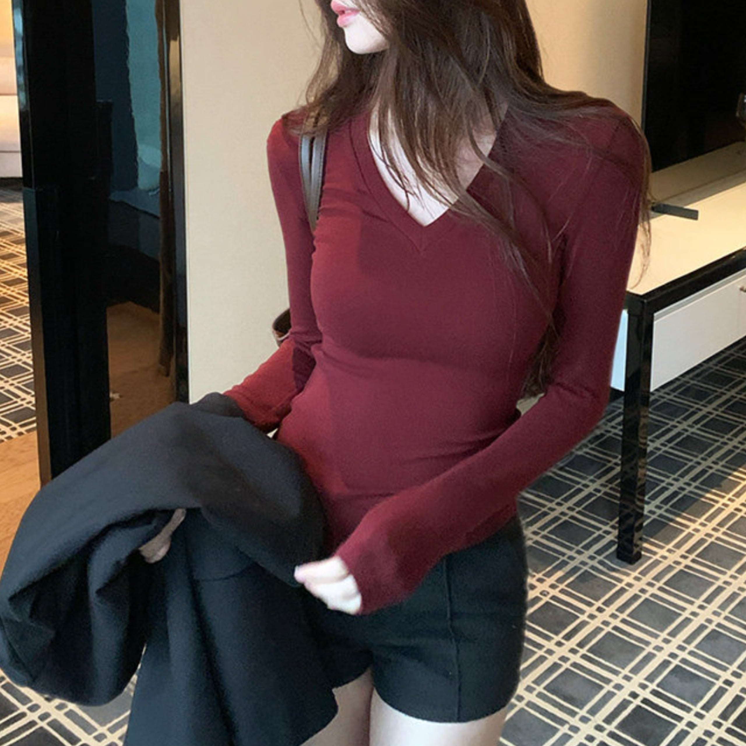 Vネックソフトラインフィットトップス(4color) A1157