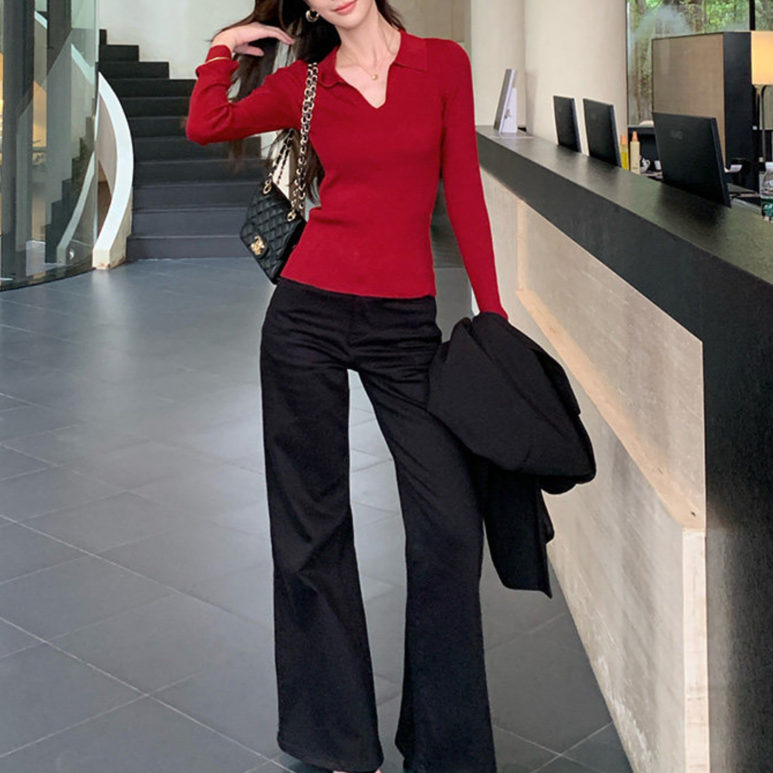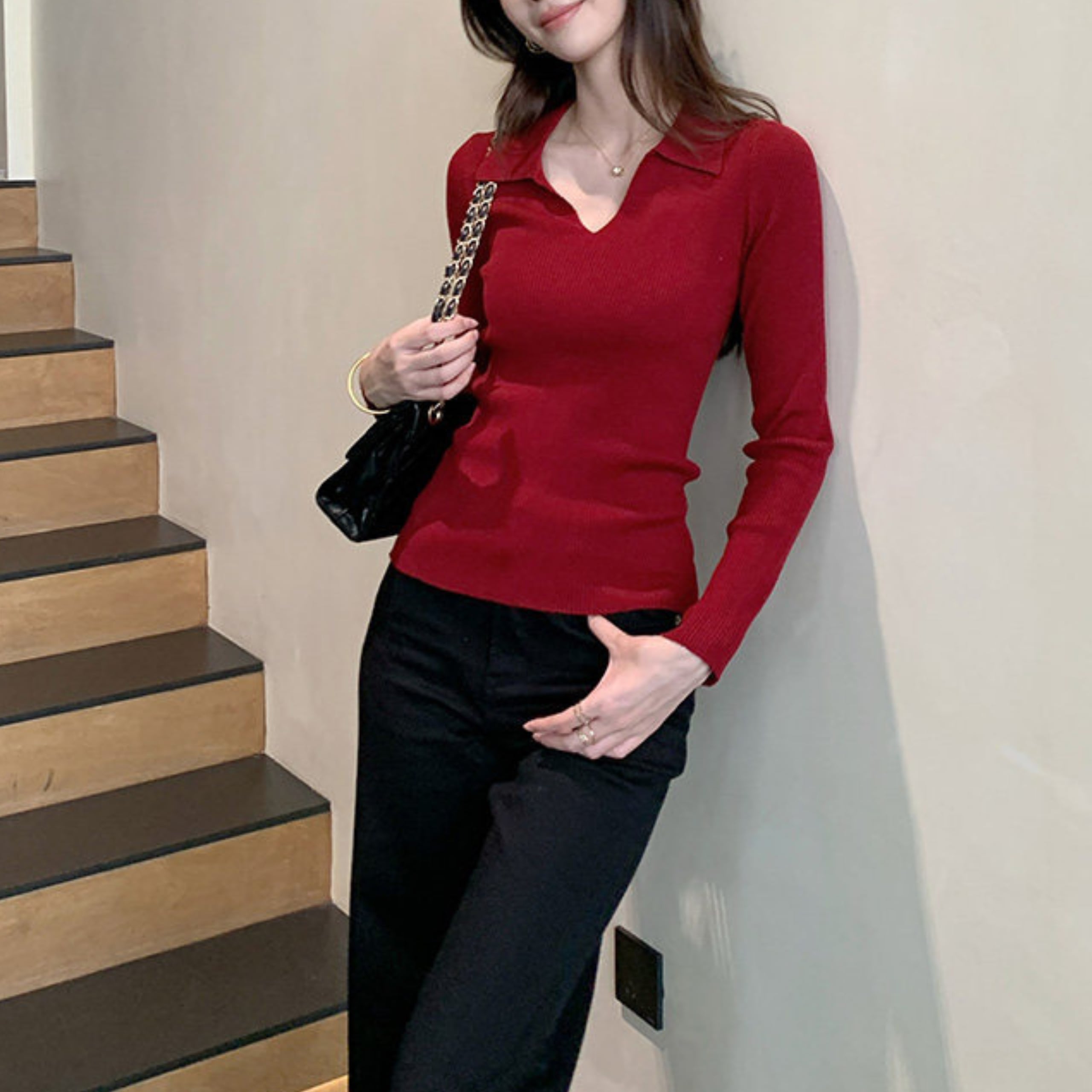 襟付きデザインとリブの縦ラインで、首元はすっきり、全体は上品に。