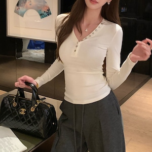 程よく開いたネックラインとボタンディテールが、首元をすっきり見せてくれるリブトップス。