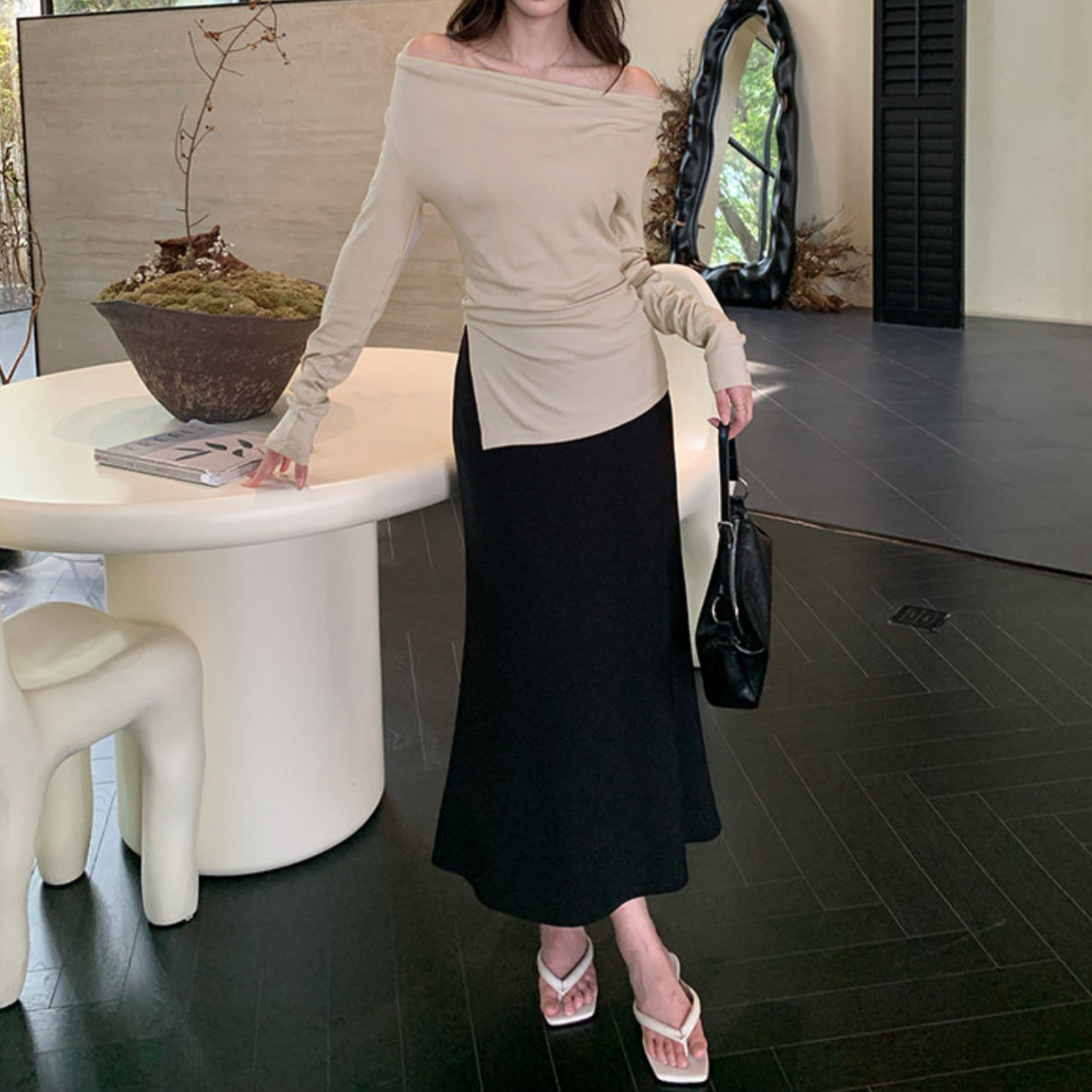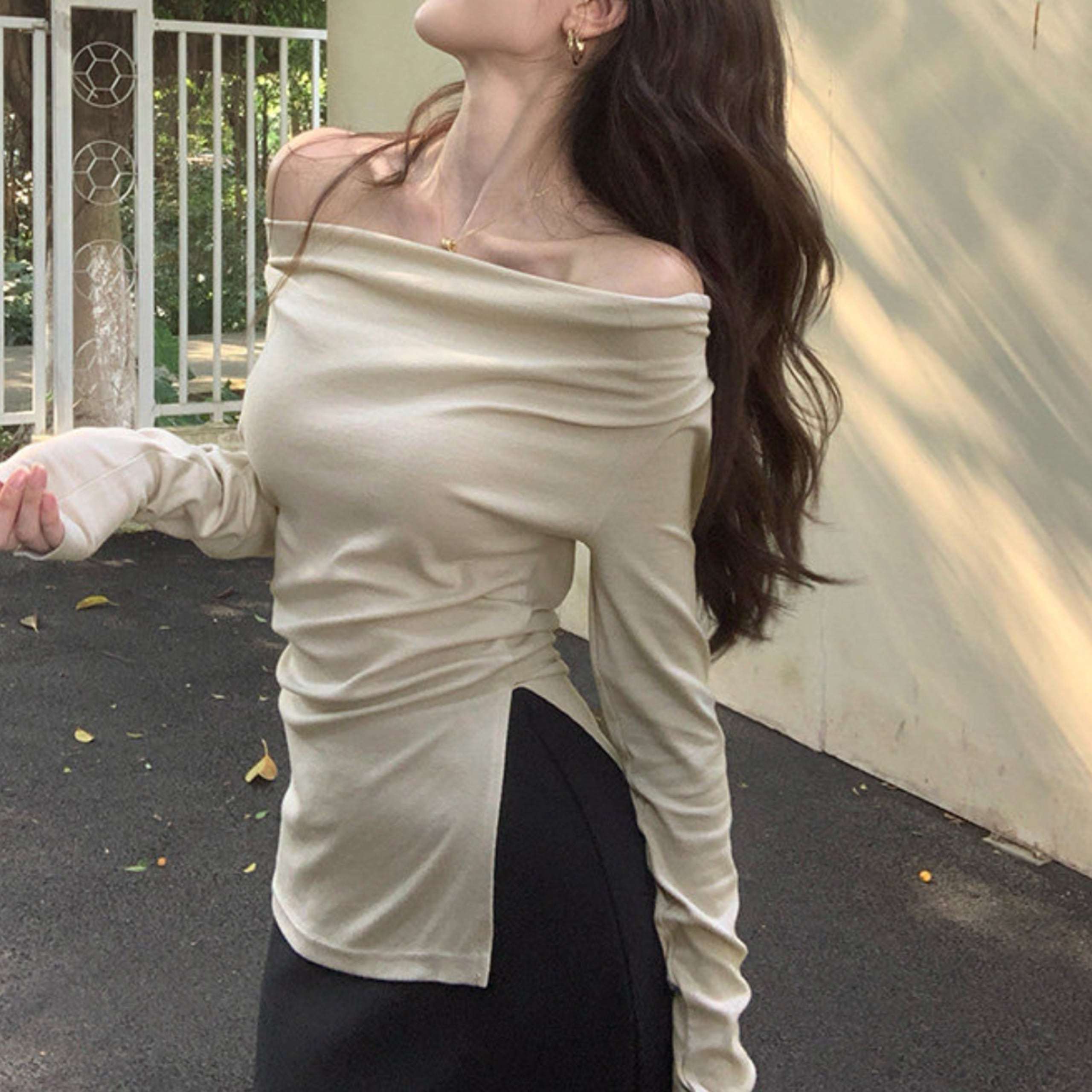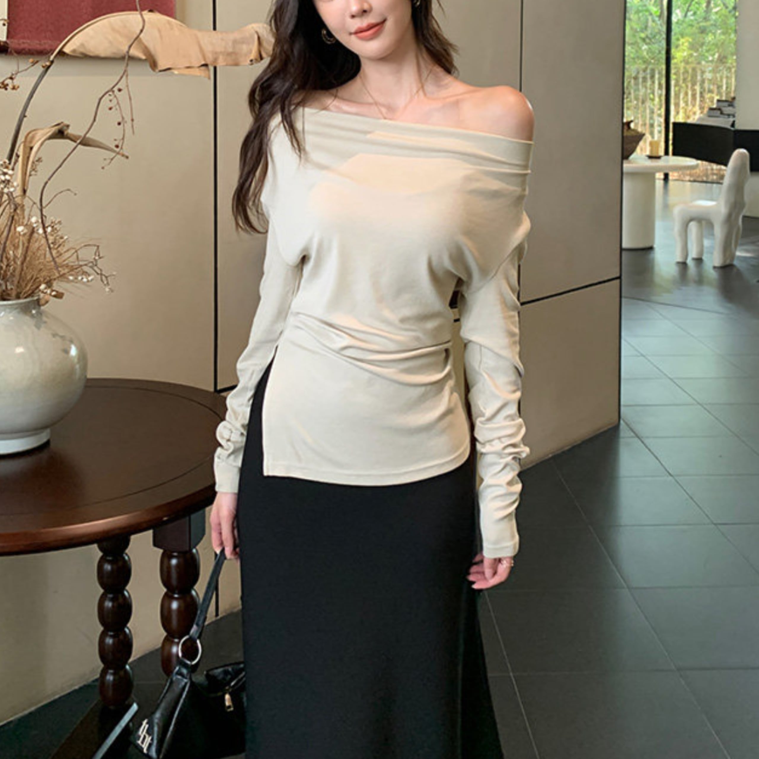 ワンショルダーデザインが印象的な大人トップス。