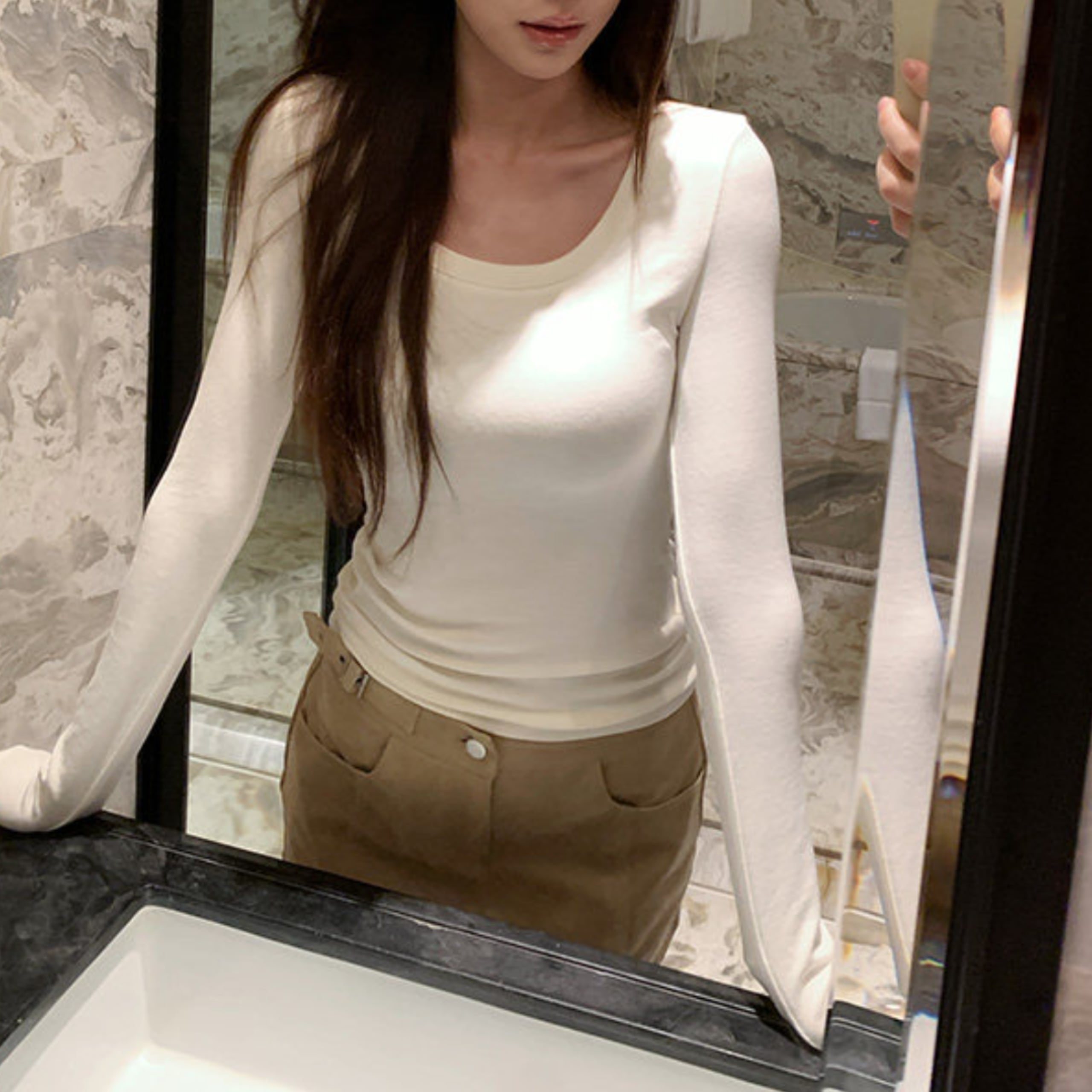 身体に自然に沿うフィット感が魅力の長袖トップス。
