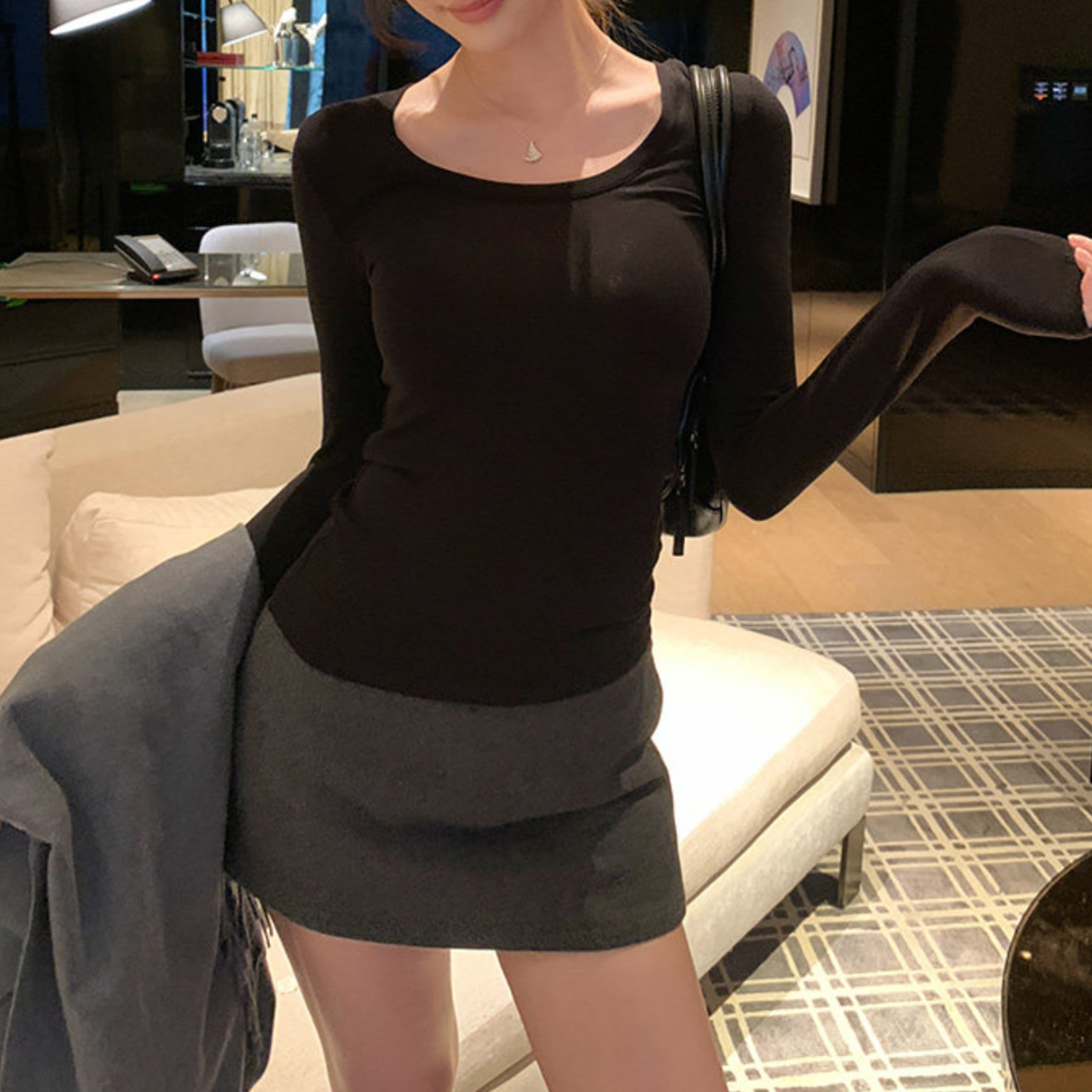 デコルテを美しく見せるスクエアネックと、