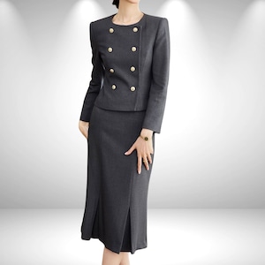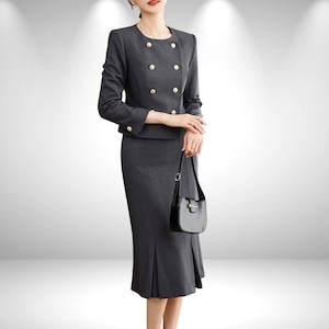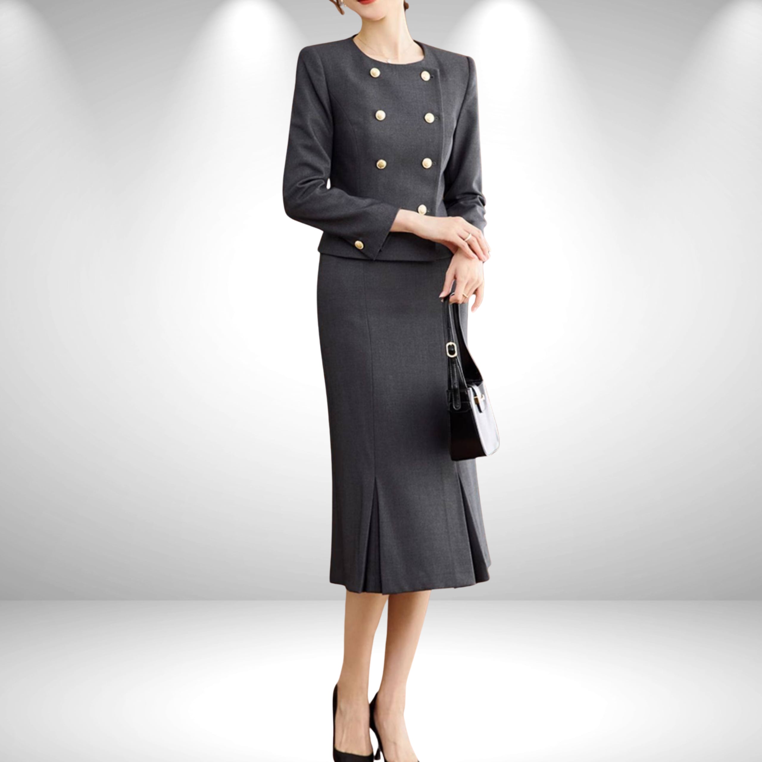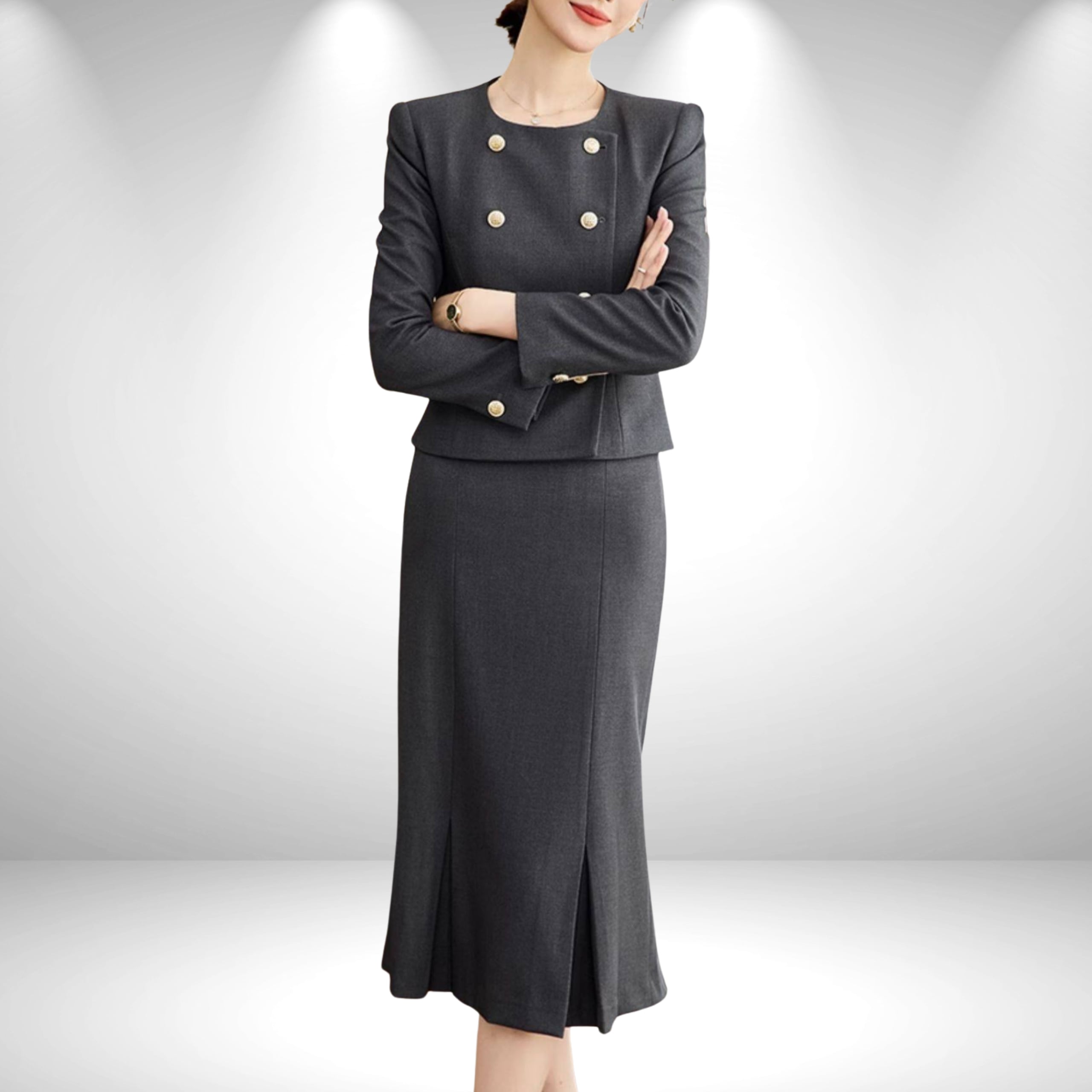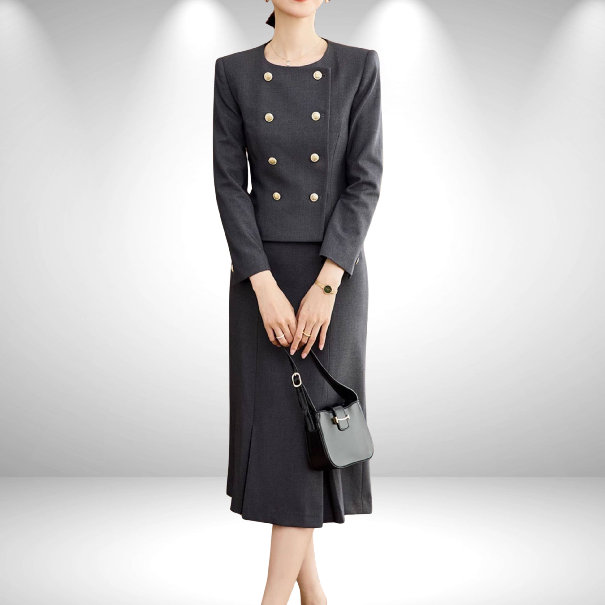 洗練されたダブルボタンデザインが印象的な、