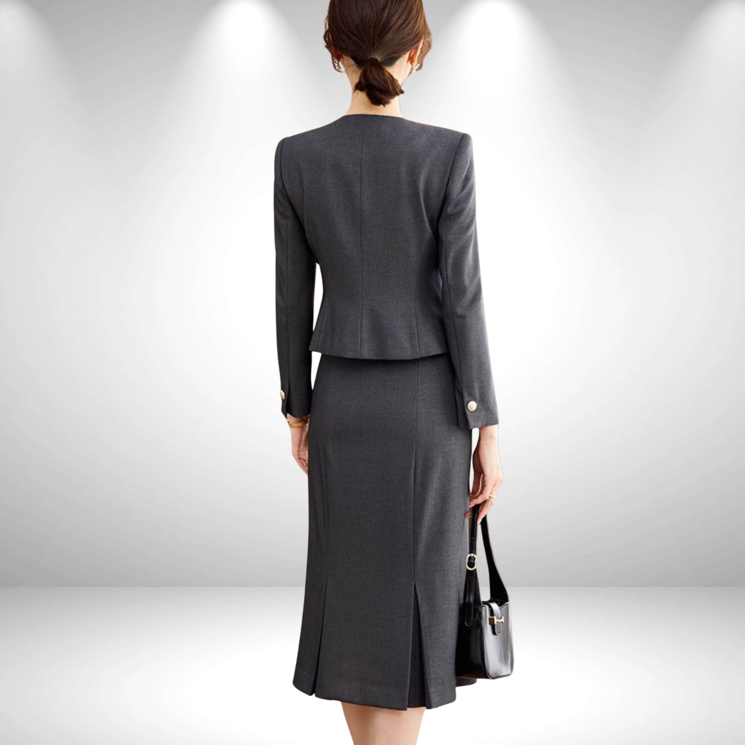 スカートは縦ラインを強調するシルエットで、