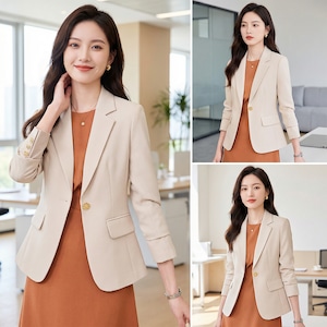 洗練されたジャケットと、女性らしいシルエットのワンピースを組み合わせた、