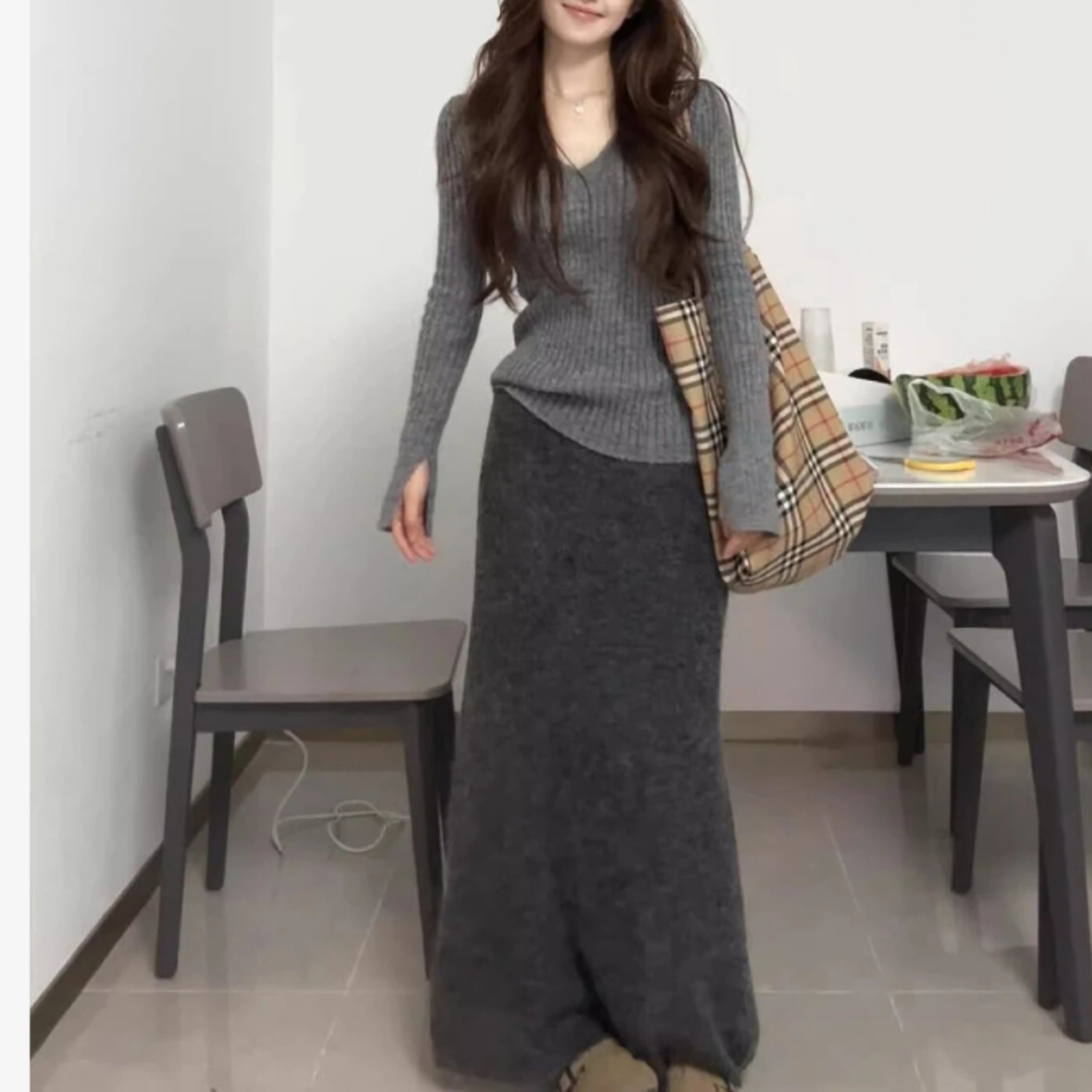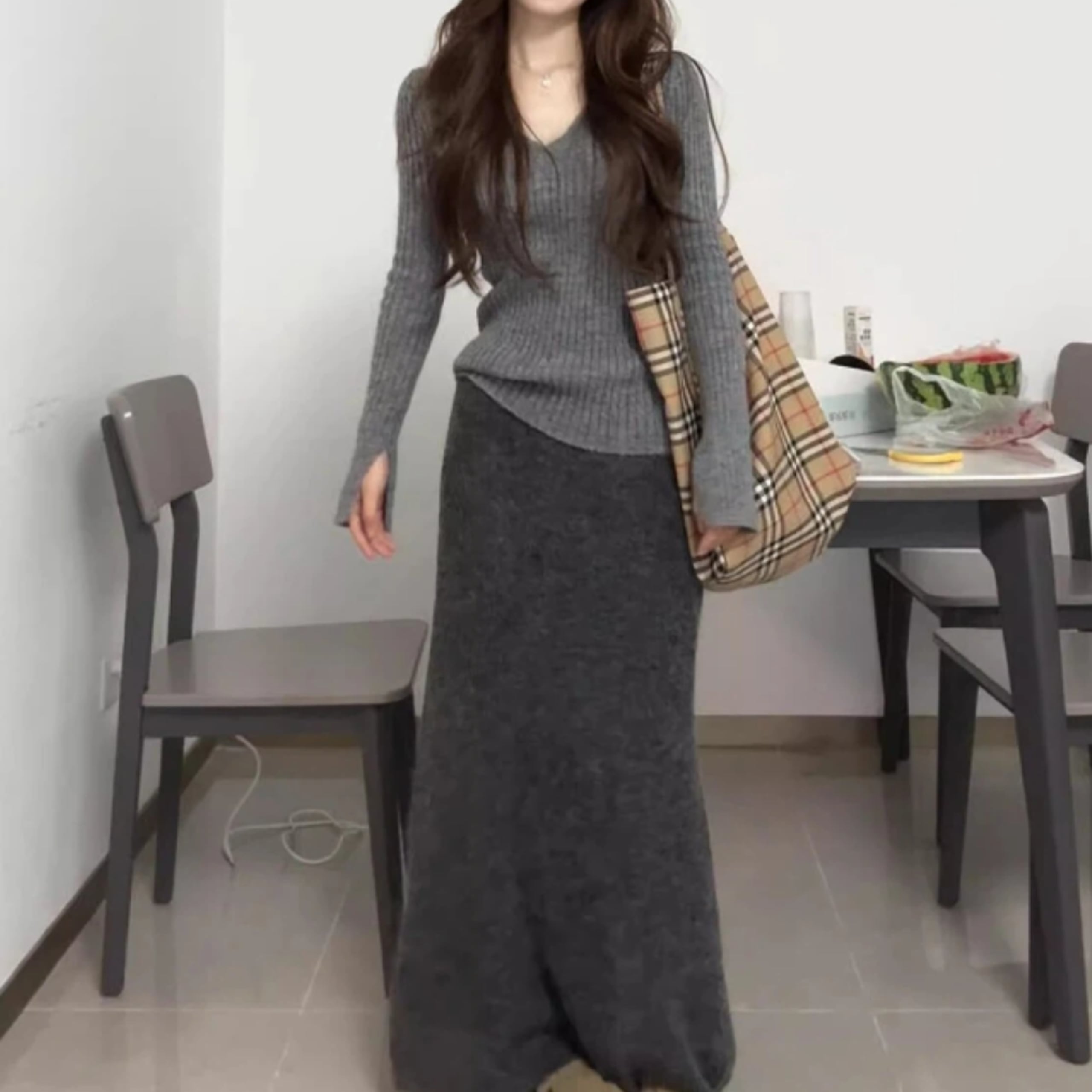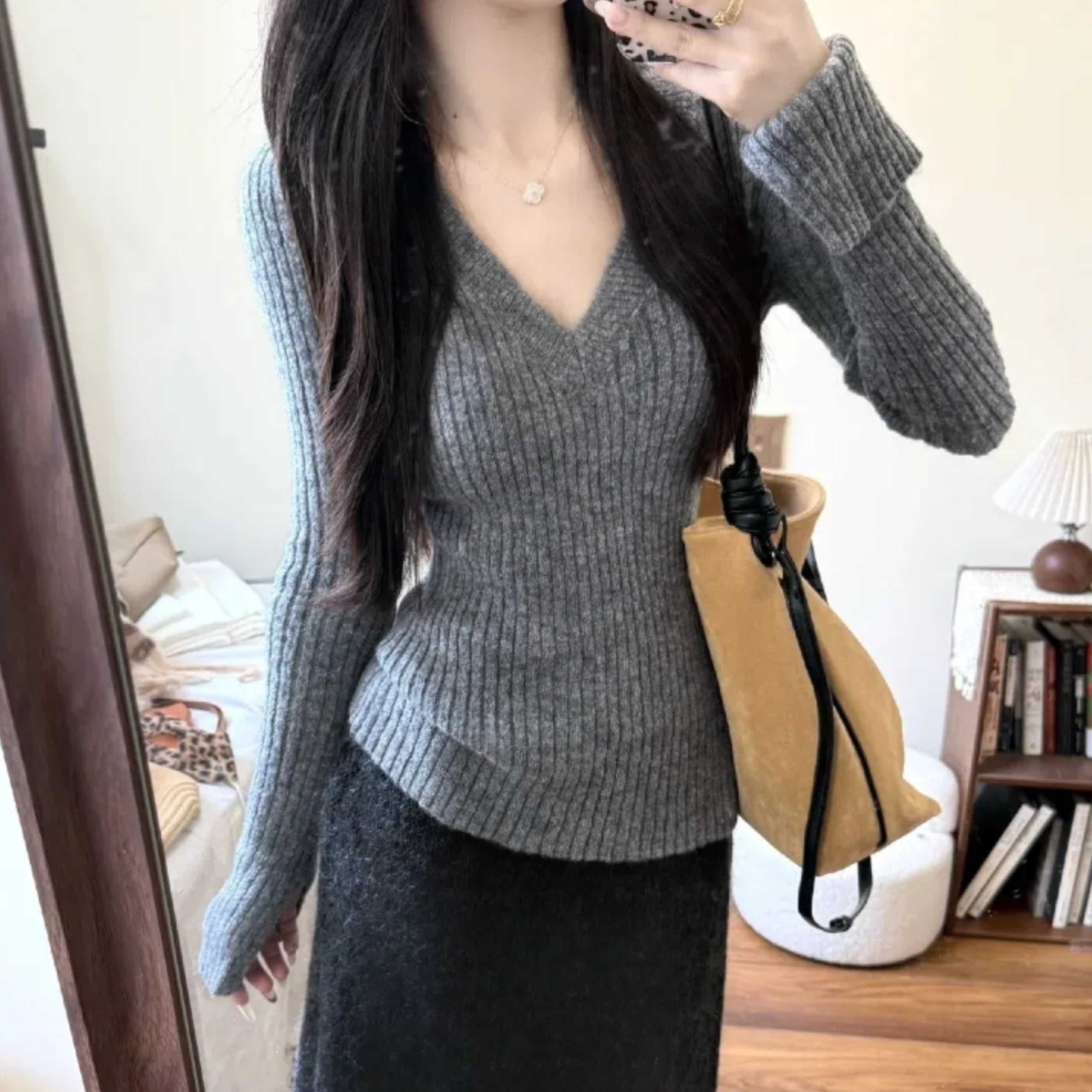 トップスとスカートの上品なセットアップ。