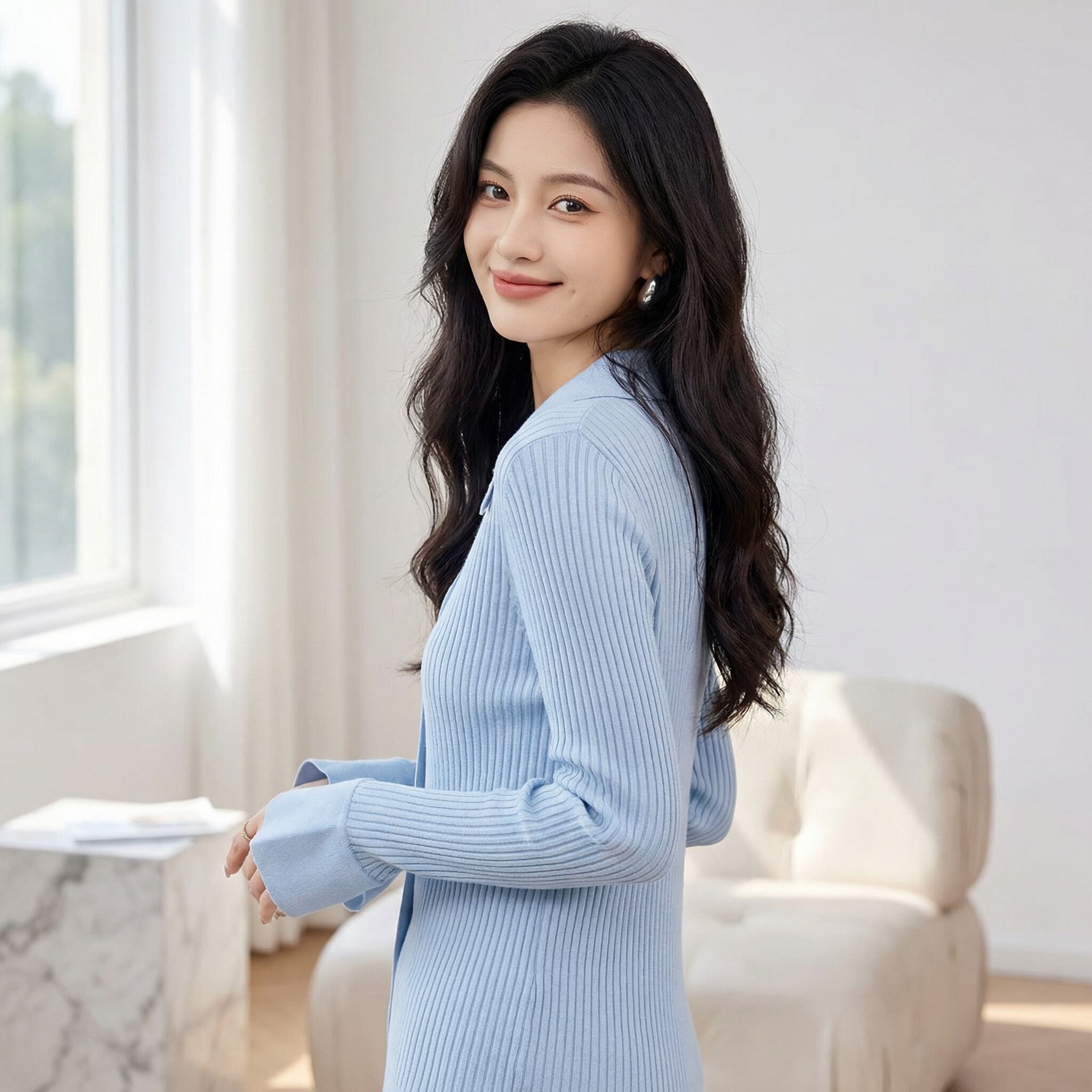 ライトブルーVネックスリムニット A0431
