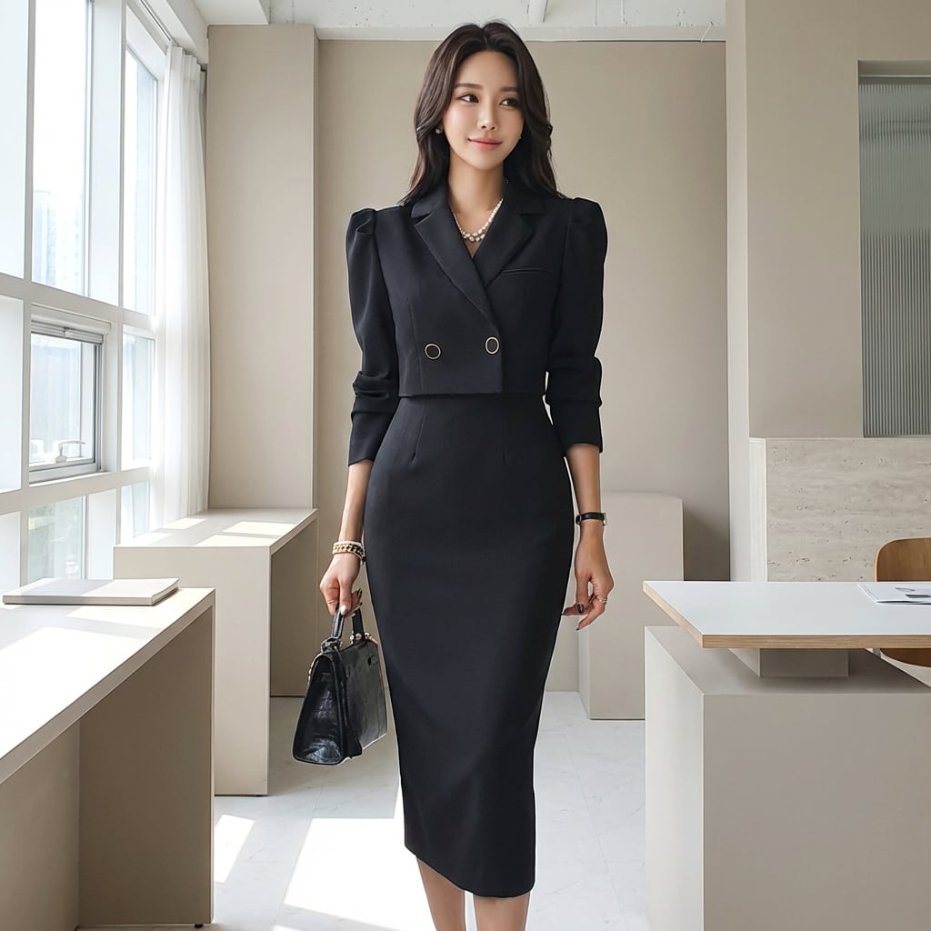 長め丈でシンプルなデザインのブラックワンピースです。落ち着いた色合いの黒が大人っぽい印象を与える一着です。胸元のボタンデザインがさりげないアクセントになっています。