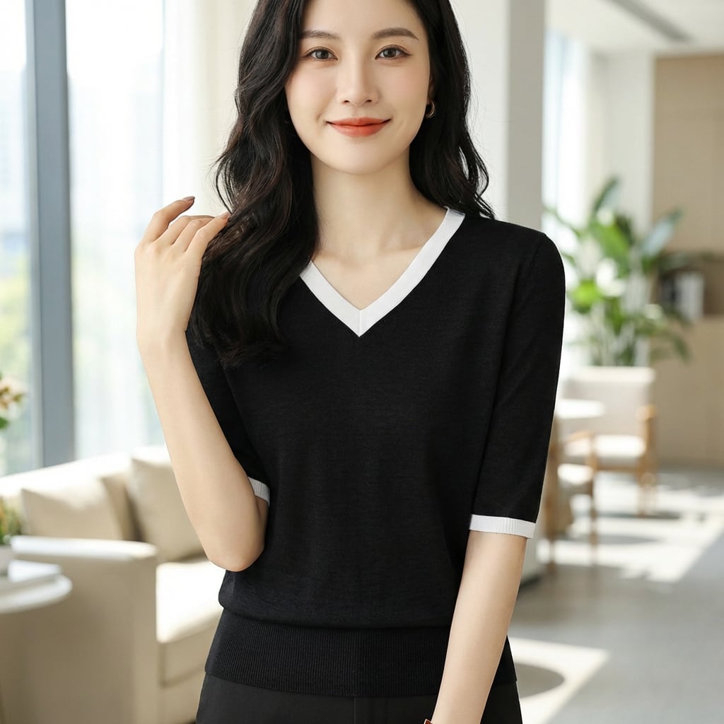 Vネックのリブ編み半袖ニットはシンプルながらも洗練されたVネックデザインと、程よく体にフィットするリブ編みが、女性らしいシルエットを演出します。カジュアルなスタイルにも、オフィスシーンにも合わせやすく、幅広いコーディネートを楽しめます。デイリーユースに最適なアイテムです。